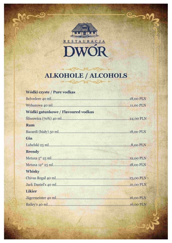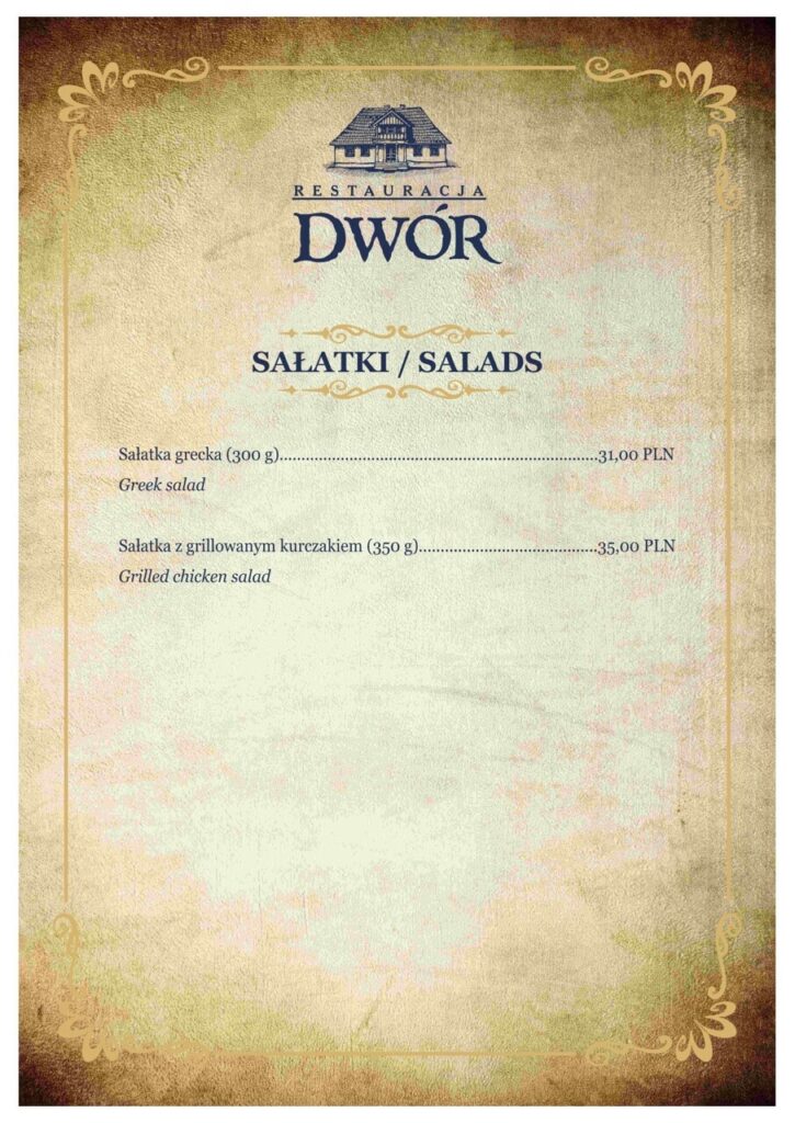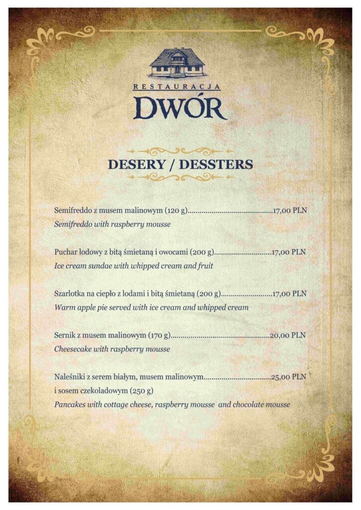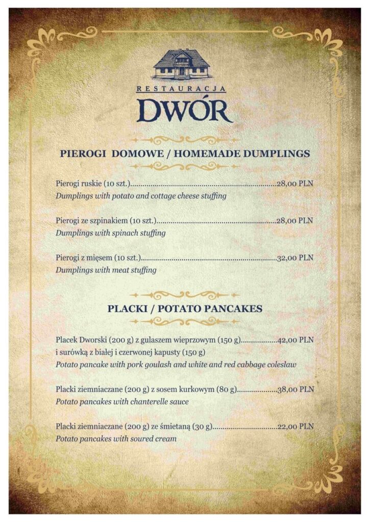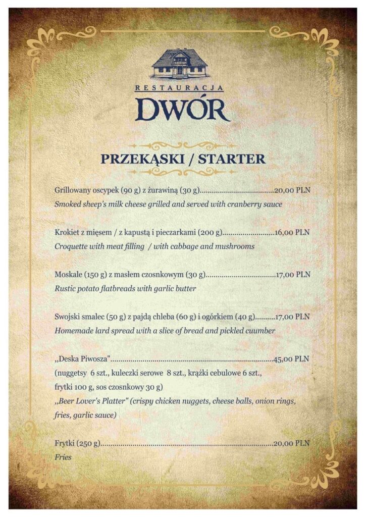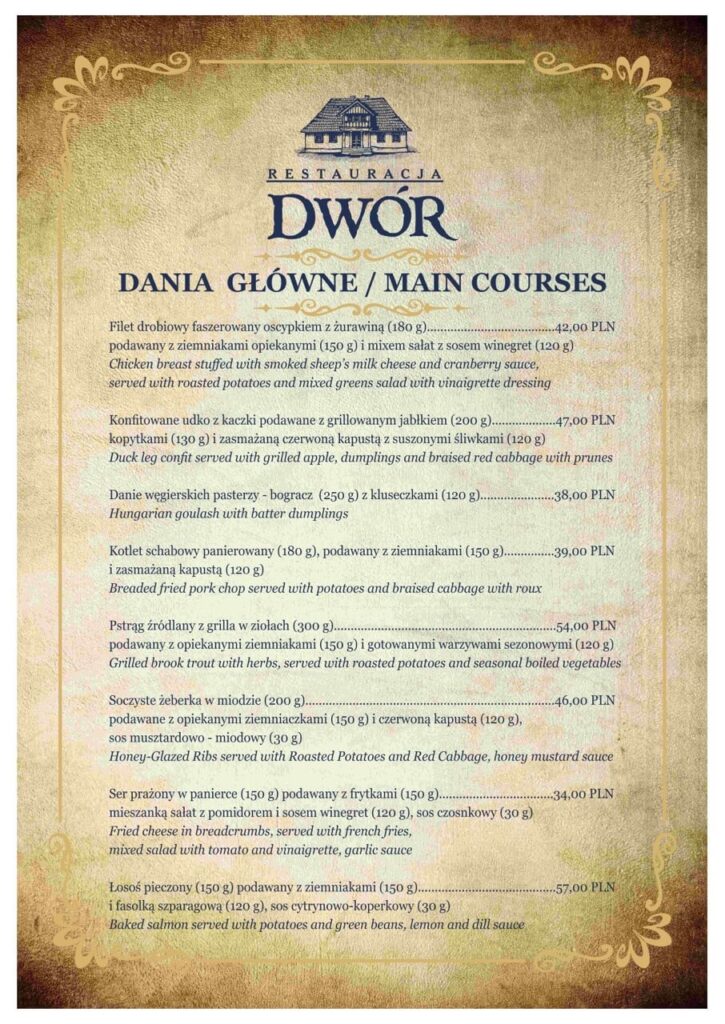 Restauracja „Dwór” serwuje dania kuchni polskiej z elementami kuchni węgierskiej.